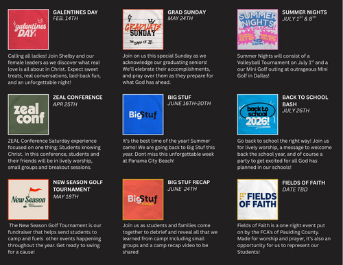 If you missed the Kickoff , DO NOT WORRY! Please take a look at the calendar above where we have all the scheduled important events of the year! Some dates are still TBD as we're still waiting for the host of those events to release a date. Any changes to these scheduled dates will be notified to you guys as soon as possible! We got a lot planned for this year and we are so pumped to see God move!