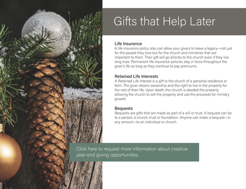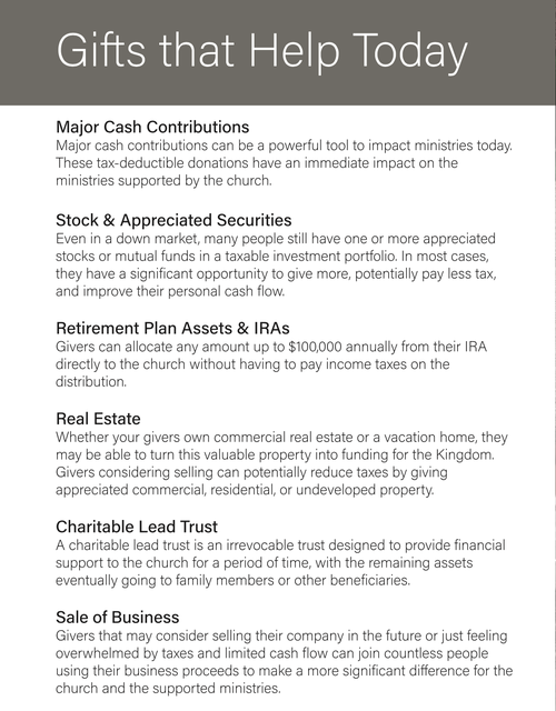 Have you ever considered the opportunity to give appreciated, non-cash assets such as real-estate, business interests, or stocks to support the ministries you love and want to see happening years from now?