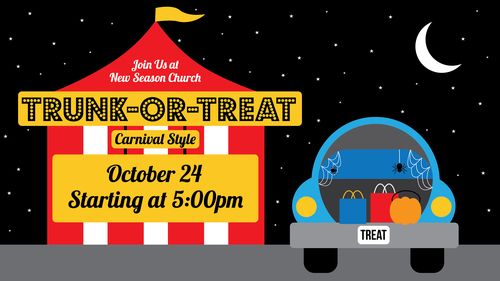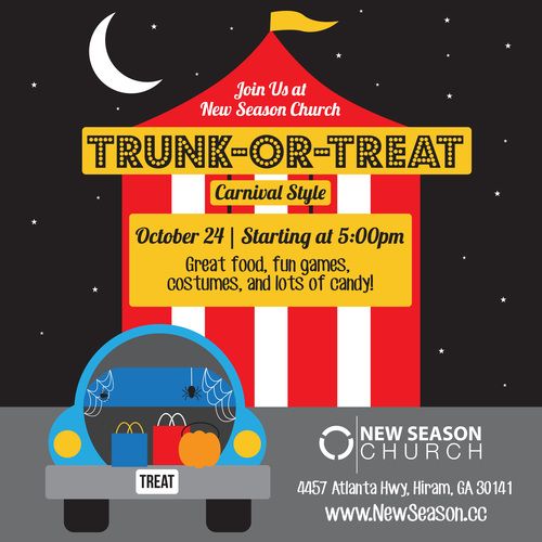 New Season Church is partnering with local vendors to host a CARNIVAL Trunk or Treat for our community! We invite you to dress up, decorate the trunk of your car, and pass out candy to our guests as they visit our Hiram Campus! We will have games, food, prizes, and SO MUCH MORE!